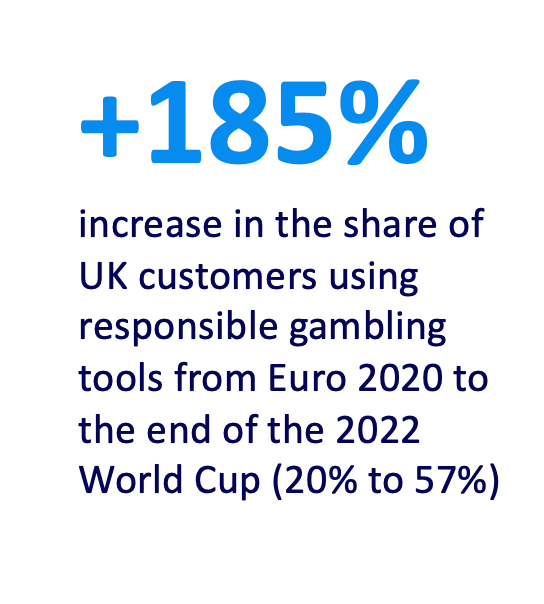 To highlight this, it is worth looking at data from our UK market in the last major international tournament. During the World Cup in 2022, we saw an increase in the proportion of players utilising voluntary safer gaming and betting tools on their account. Just before the World Cup kicked off in 2022, around 45% of our UK customer base had at least one voluntary control tool on their account. By the time the World Cup ended, it had increased to 57%. For comparison against Euro 2020, around 20% were using RG tools during that tournament. That represents an increase of 185% on Euro 2020.